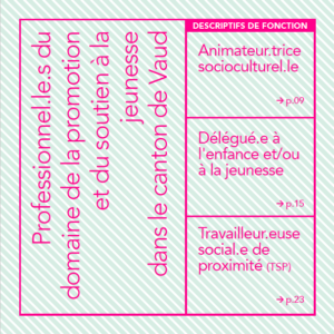 La brochure « Professionnel-le-s du domaine de la promotion et du soutien à la jeunesse dans le canton de Vaud », présente les différences et complémentarités des fonctions d’animateur-trice socioculturel-le, de délégué-e à l’enfance et/ou à la jeunesse et de travailleur-euse social-e de proximité (TSP).